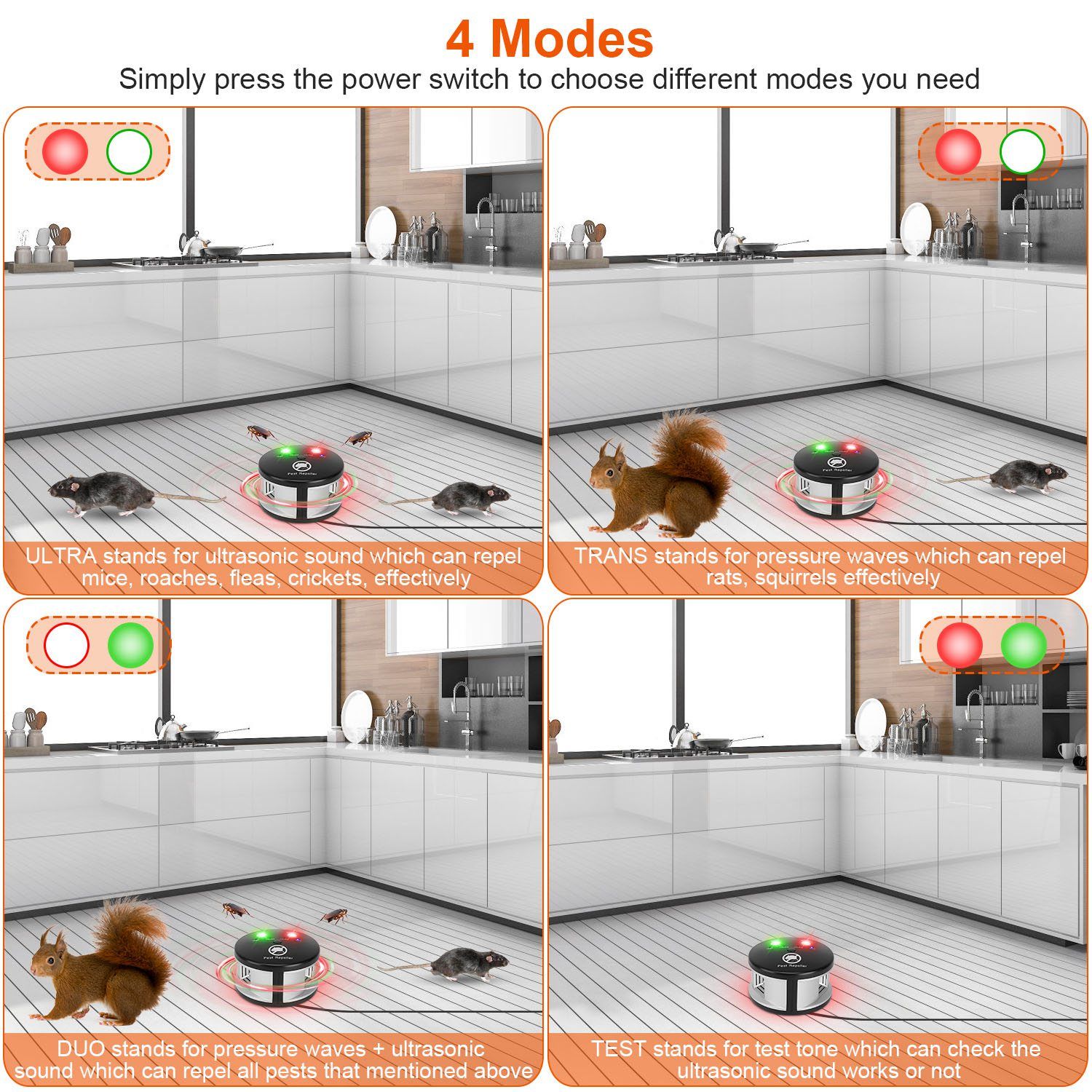 *4 Modes*:Simply press the power switch to choose different modes you need. ULTRA stands for ultrasonic sound which can repel mice; roaches; fleas; crickets; effectively. TRANS stands for pressure waves which can repel rats; squirrels effectively. DUO stands for pressure waves+ultrasonic sound which can repel all pests that mentioned above. TEST stands for test tone which can simulate the sounds that pest hear to check the ultrasonic sound works or not.