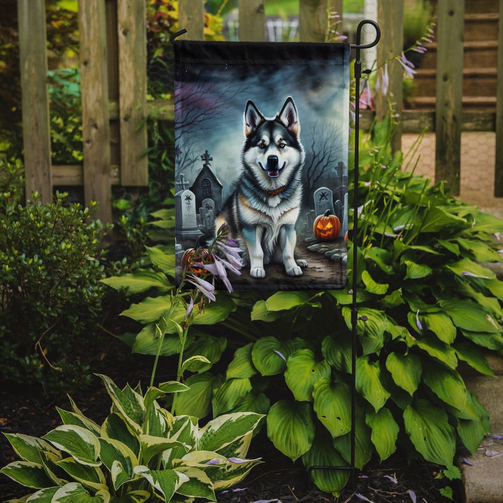 Garden Flag featuring breed specific Alaskan Malamute artwork. Celebrate Halloween with this Halloween Garden Flag. Enhance the beauty of your garden, patio, or yard with Caroline's Treasures Decorative Garden Flag, proudly made in the USA. Crafted from two pieces of thick, double-sided polyester fabric, this 2-ply garden flag is designed to withstand various weather conditions, making it water-resistant and weatherproof. Featuring correctly readable words on both sides, this garden flag offers a delightful visual experience from any angle. With its heavier weight, it stands out among other garden flags, ensuring stability and durability even in wind, rain, and snow. Measuring approximately 11 1/4 inches by 15 1/2 inches, this flag allows you to personalize your outdoor decor. It comes with a 1 1/2-inch sleeve sewn in, allowing easy attachment to any standard garden flag stand or garden size porch hanger (sold separately). Make a statement in your outdoor space with Caroline's Treasures Decorative Garden Flag, a vibrant and high-quality flag that adds color and personality to your surroundings. Proudly made in the USA, it's a symbol of quality craftsmanship and attention to detail.