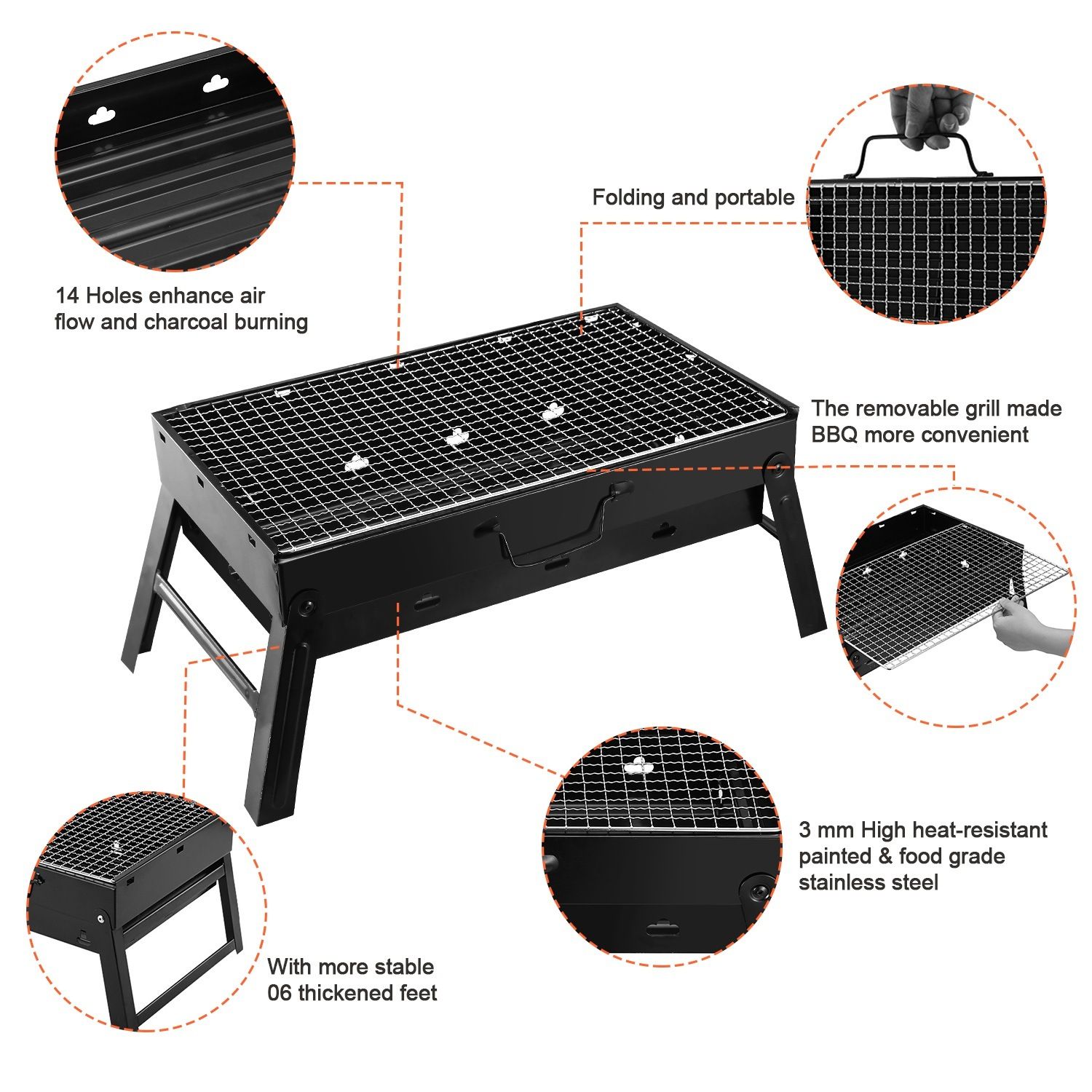 ENOUGH GRILLING ROOM& BURNING HELPFUL HOLES DESIGN:17' long and 10' wide of chrome-plated cooking grate gives you enough room to get your whole meal on the grill at once(Cooking bars are 3 mm in diameter). 14 Holes at each side and bottom enhance air flow and charcoal burning.