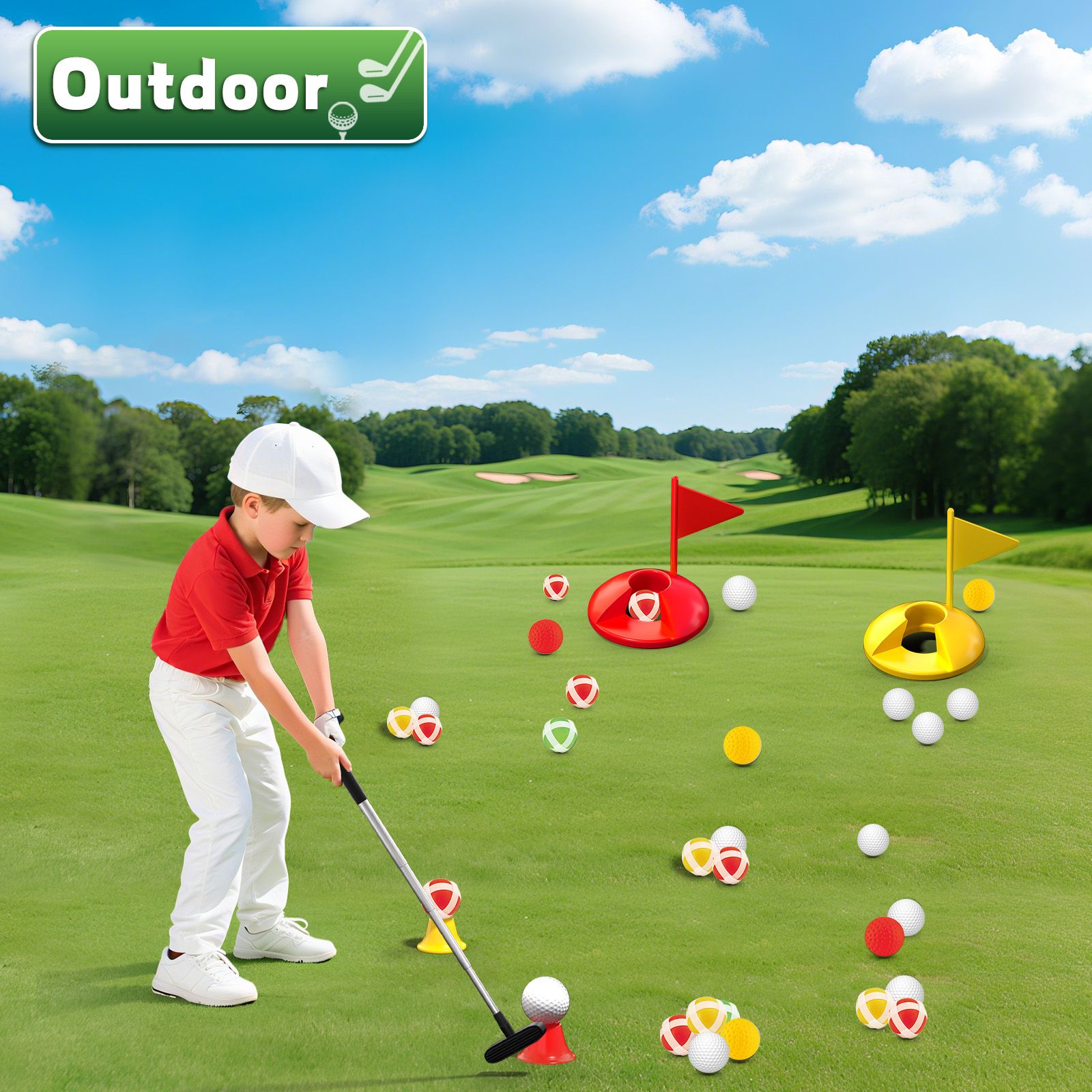 This golf set specially designed for children brings the professional golf course right into the home. It includes 3 lightweight golf clubs of different angles, multi-color safety soft balls, and a red-yellow-green dual-hole putting green. Whether in the living room, on the lawn, or on the beach, you can quickly set up a mini golf course and start a family sports time.