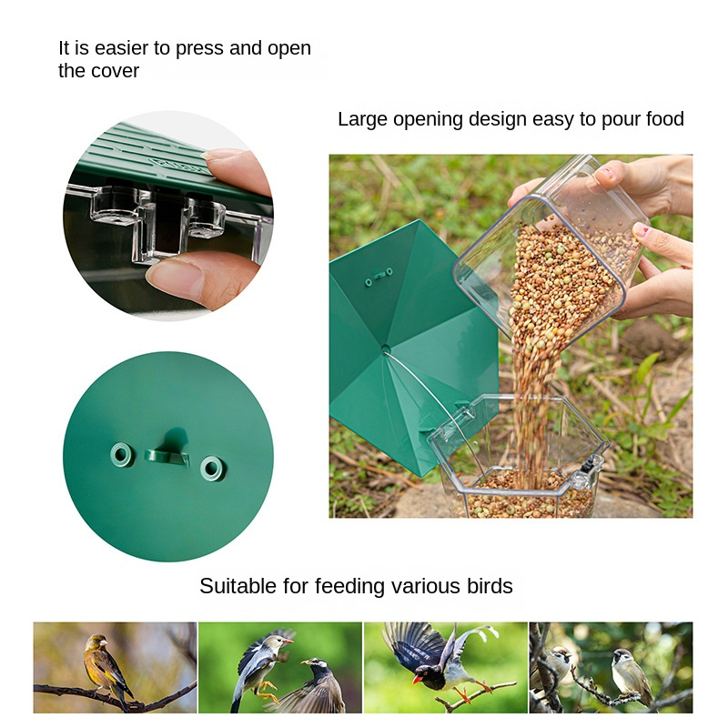 Easy to Open and Fill: Just flick the locking; you can open the feeders and fill the food into it. You don't need to unscrew the cover like a hexagonal-shaped feeder. And the wide mouth is also make filling easier.