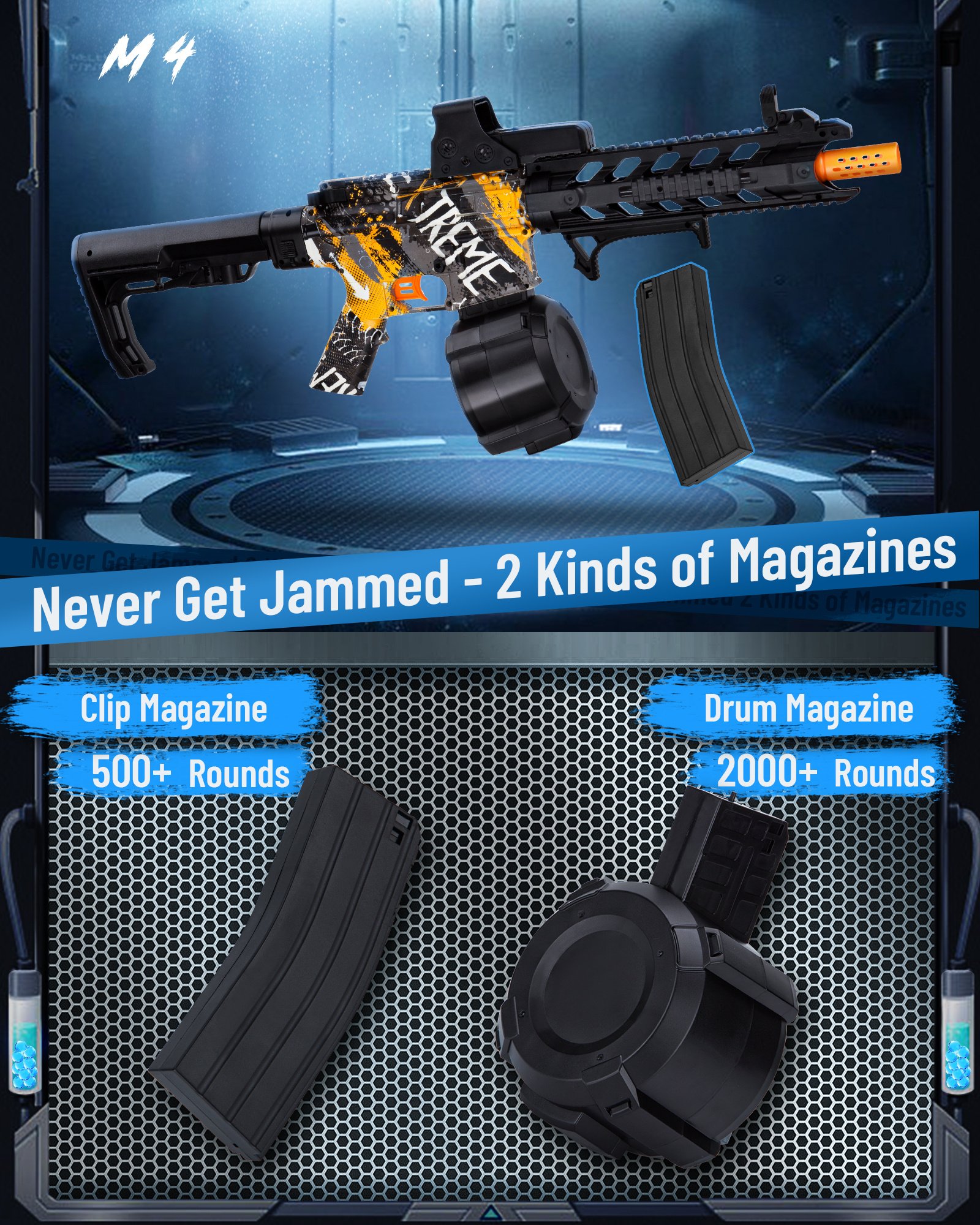 [Cool AKM Orbi Gun]: This gel ball blaster gun is a new style designed. The motor has been upgraded and improved for better stability. With hard gears, the gel ball injector lasts longer. ABS makes the splash ball jet more durable, drop-resistant, and more heat-resistant. This splat gun charges very fast and lasts longer.