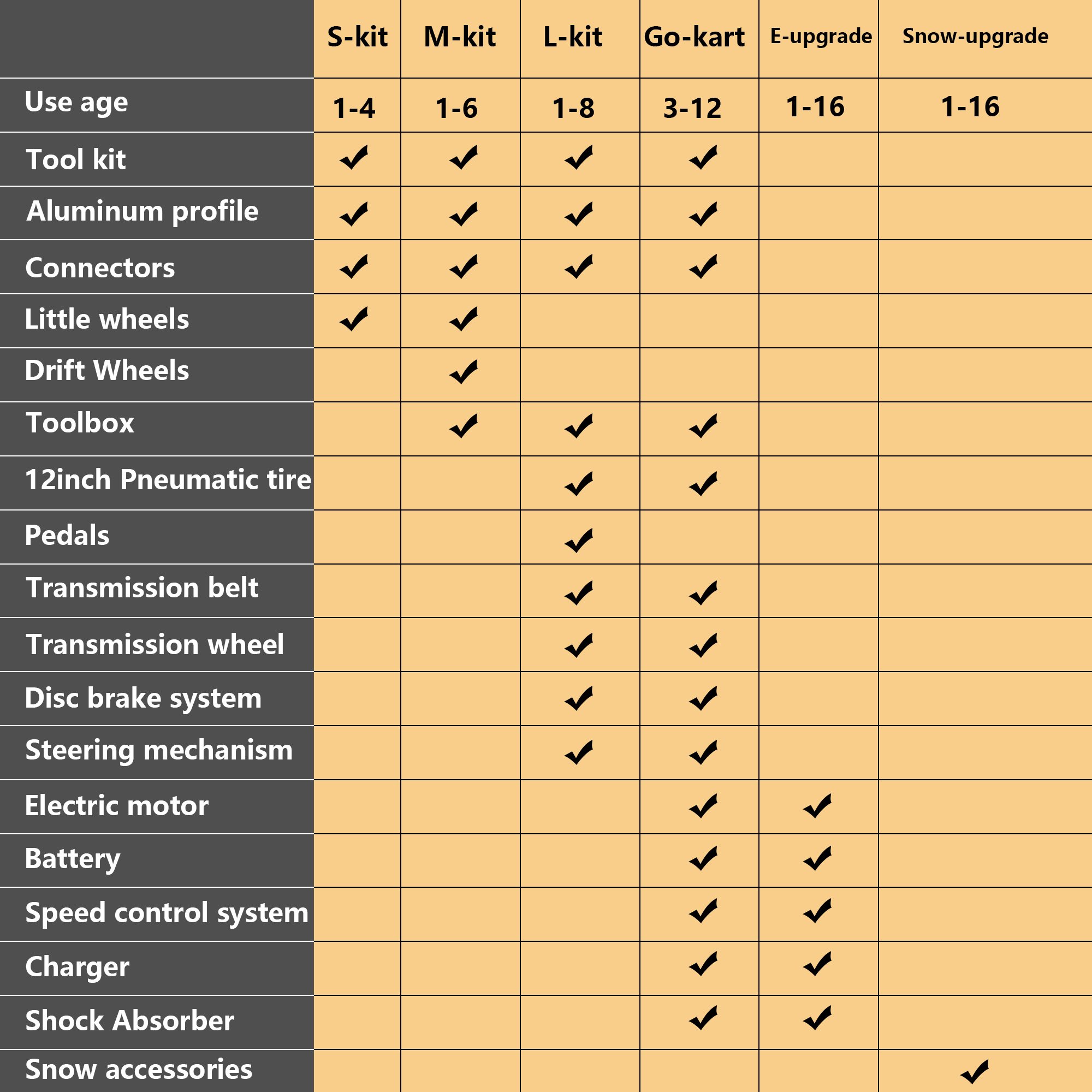FeaturesThe perfect gift for kidsDesigned by a young team at a diverse technology company, the product is an innovative modular toy. Parents can assemble and play with their children and enjoy an interesting experience. Such interesting products can infinitely stimulate children's imagination and creativity.Variety ToysS-kit is the most basic one in our kit series, suitable for children aged 1-4. Adopt simple modular design, so more creative new combinations can be realized, at least 20 different vehicles, including stools, two-wheel balance vehicles, three-wheel balance vehicles, two-wheel scooters, three-wheel scooters.Safety and environmental protectionThis product is safe and environmentally friendly, and has obtained CPC certification. It adopts high-strength aviation aluminum alloy profiles and BASF environmentally friendly nylon plastics, and stainless steel connectors as the main components, which are corrosion-resistant and have a long service life. The polymer rubber pad ensures the comfort of the child when riding.Simple operationThe package is equipped with a well-matched special tool box, including special pliers, high-hardness hexagonal wrench, wrench extension tube, etc., so that you can immediately install your favorite toy, ensuring the simplest and most efficient assembly processSustainable modular designThis product offers a sustainable solution with a modular design concept that simply transforms together when the child grows up, or can be upgraded to fit at any time by adding an upgrade pack. Scooters, bikes, trailers and go-karts can also be upgraded to electric mode, or can use more electric motors to provide more power. This product is suitable for almost all minors.