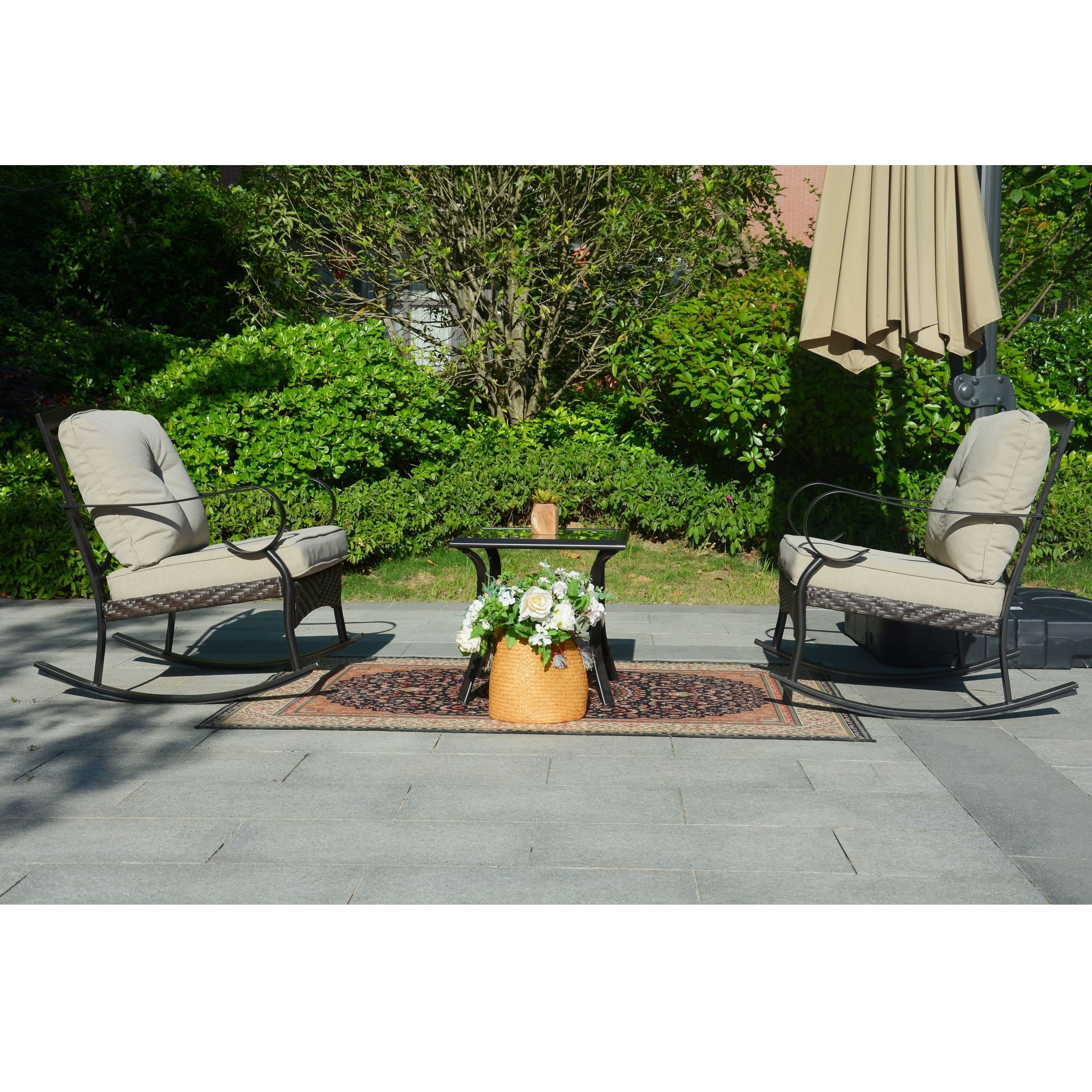 Patio Garden Wicker Rocking Chair*2 and H18.91" Table Set, Tempered Glass Top
