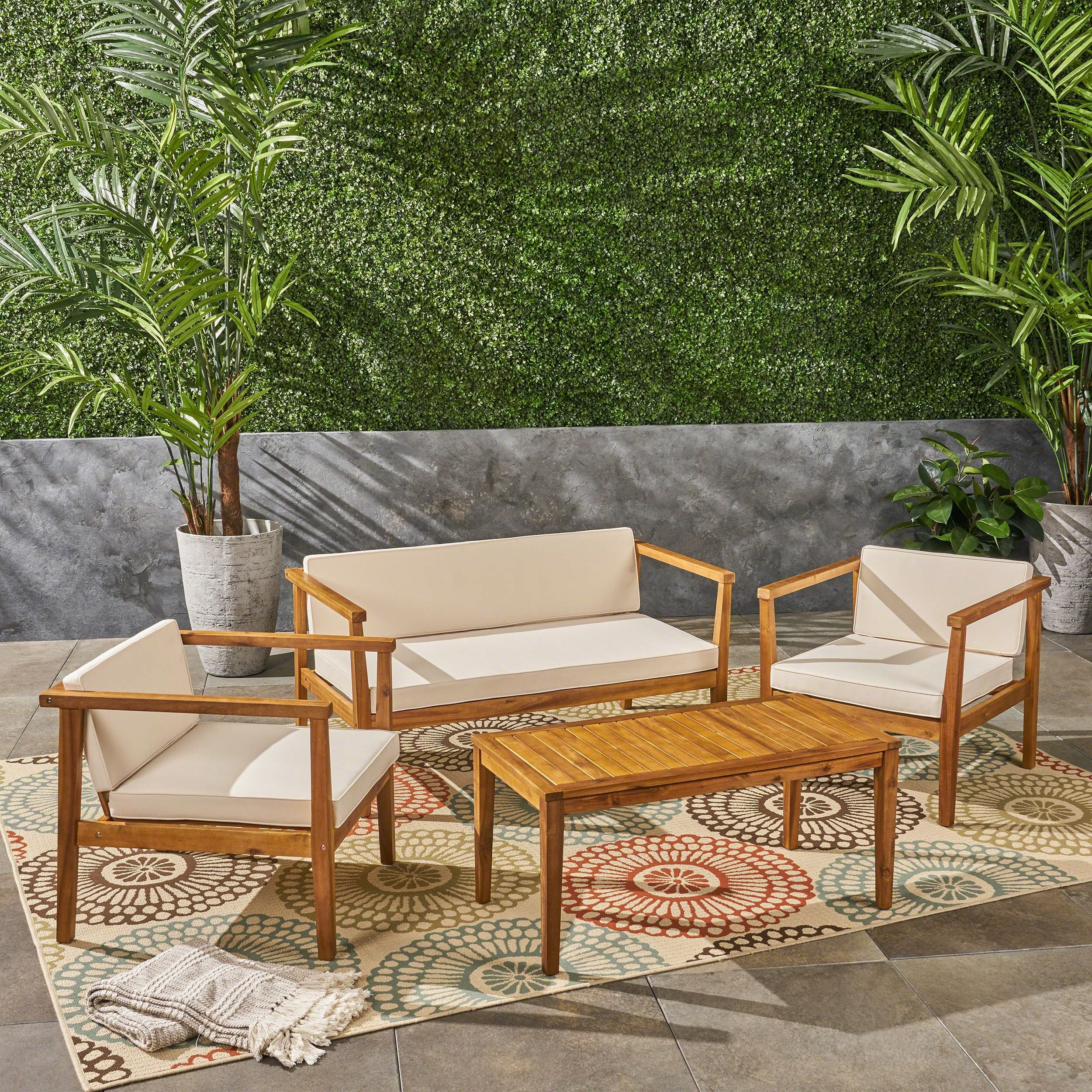 Outdoor 4-Seater Acacia Wood Chat Set with Coffee Table with Cushions, Teak and Beige