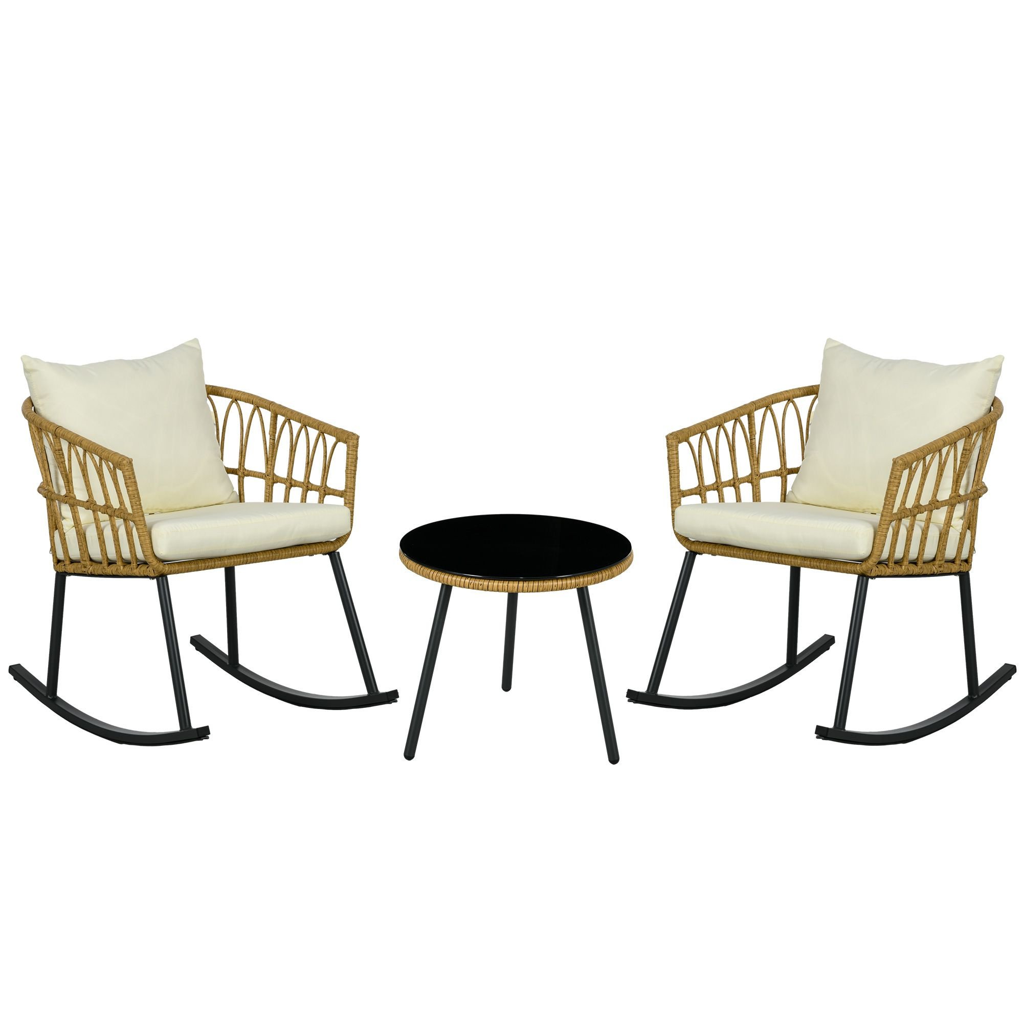 Outsunny 3 Piece Bistro Set with Cushions, Outdoor PE Rattan Wicker Patio Rocking Chair with 2 Porch Rocker Chairs