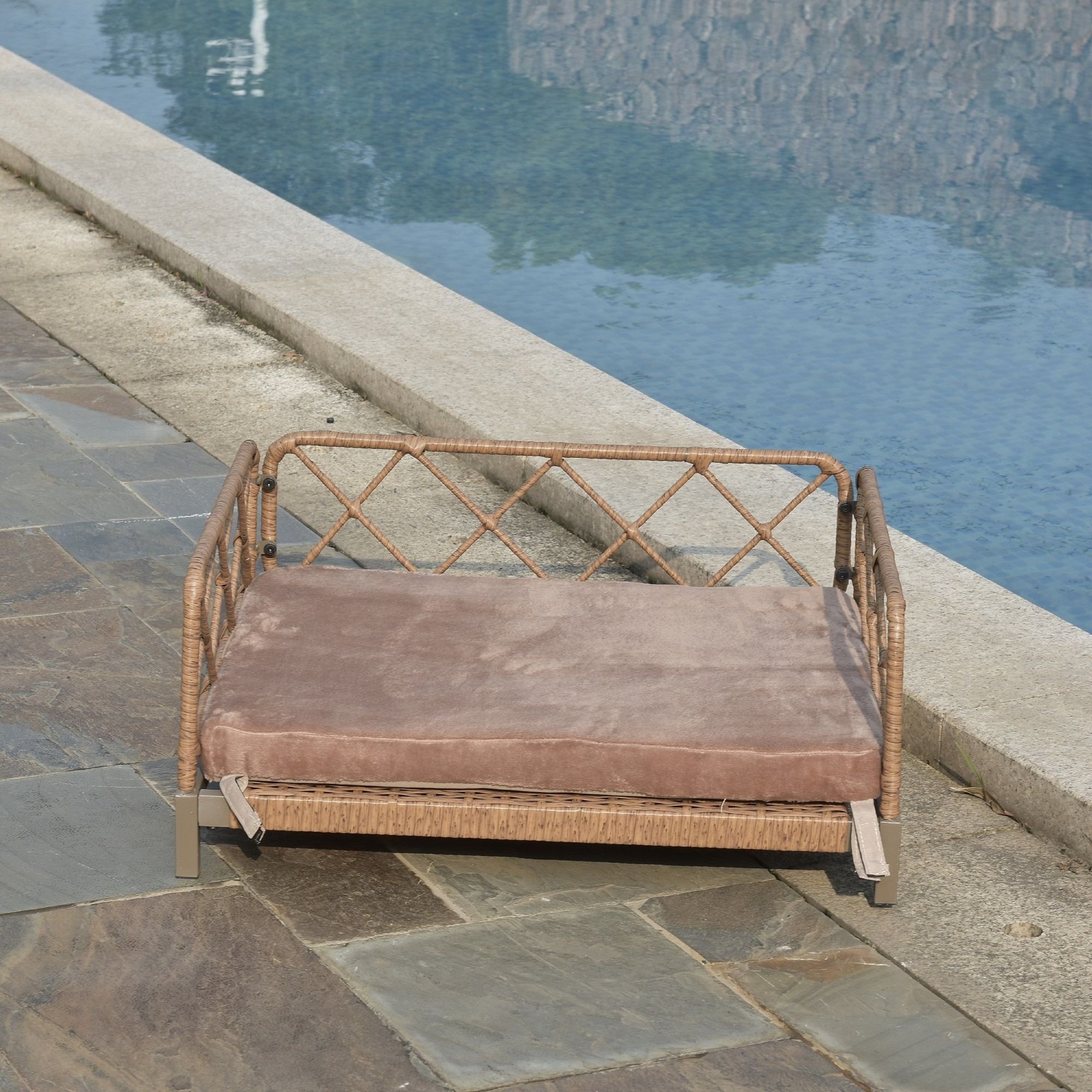 The 'hand woven' pet bedThe wicker look Rattan pet bed is woven with pliable palm stems of Rattan.Each string of the Rattan is coated with rich UV-inhibitors to minimize corrosion and flaking due to outdoor use.