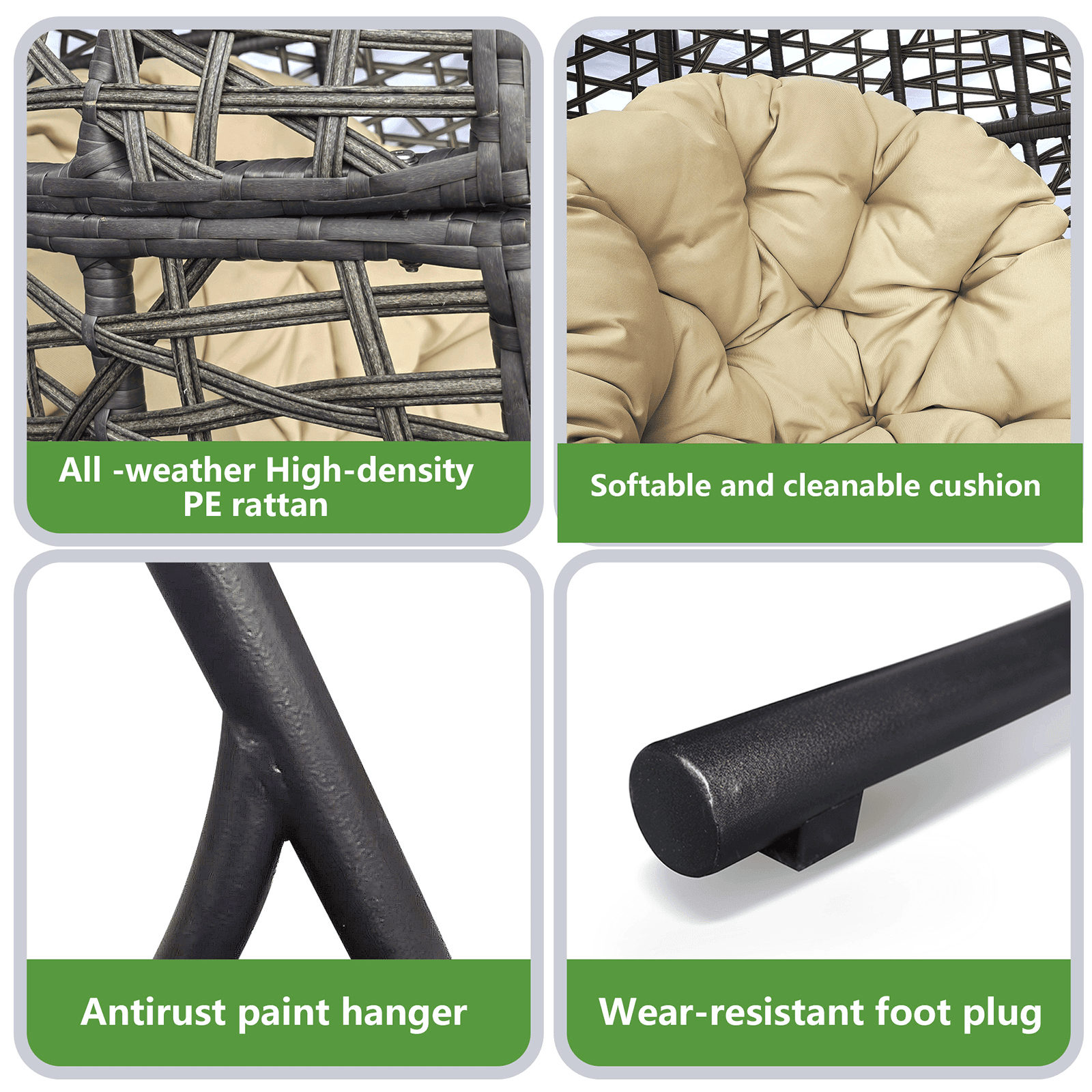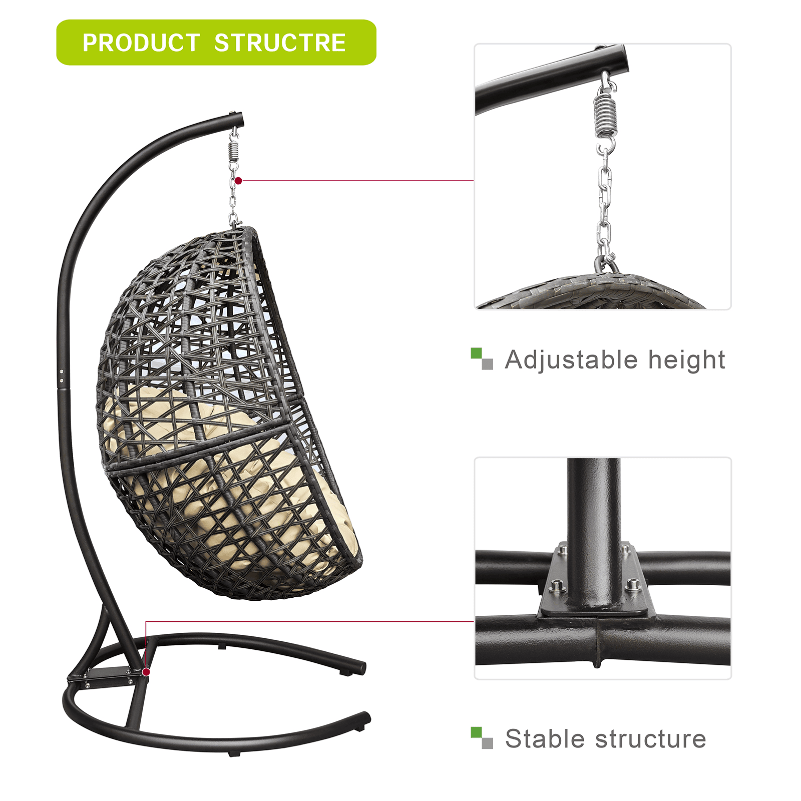 With a sturdy hanging stand base; you can place it anywhere or hang the egg hammock from the ceiling or porch. The egg nest chair comprises high-density PE rattan and all-weather waterproof fabric cushions. The stand of the hammock swing chair features a sturdy powder-coated steel frame and chain hanger; it's perfect for adding energy to your patio; backyard; porch; or poolside decor. Freestanding swing hammocks are widely used in indoor lounges; living rooms; or bedrooms.