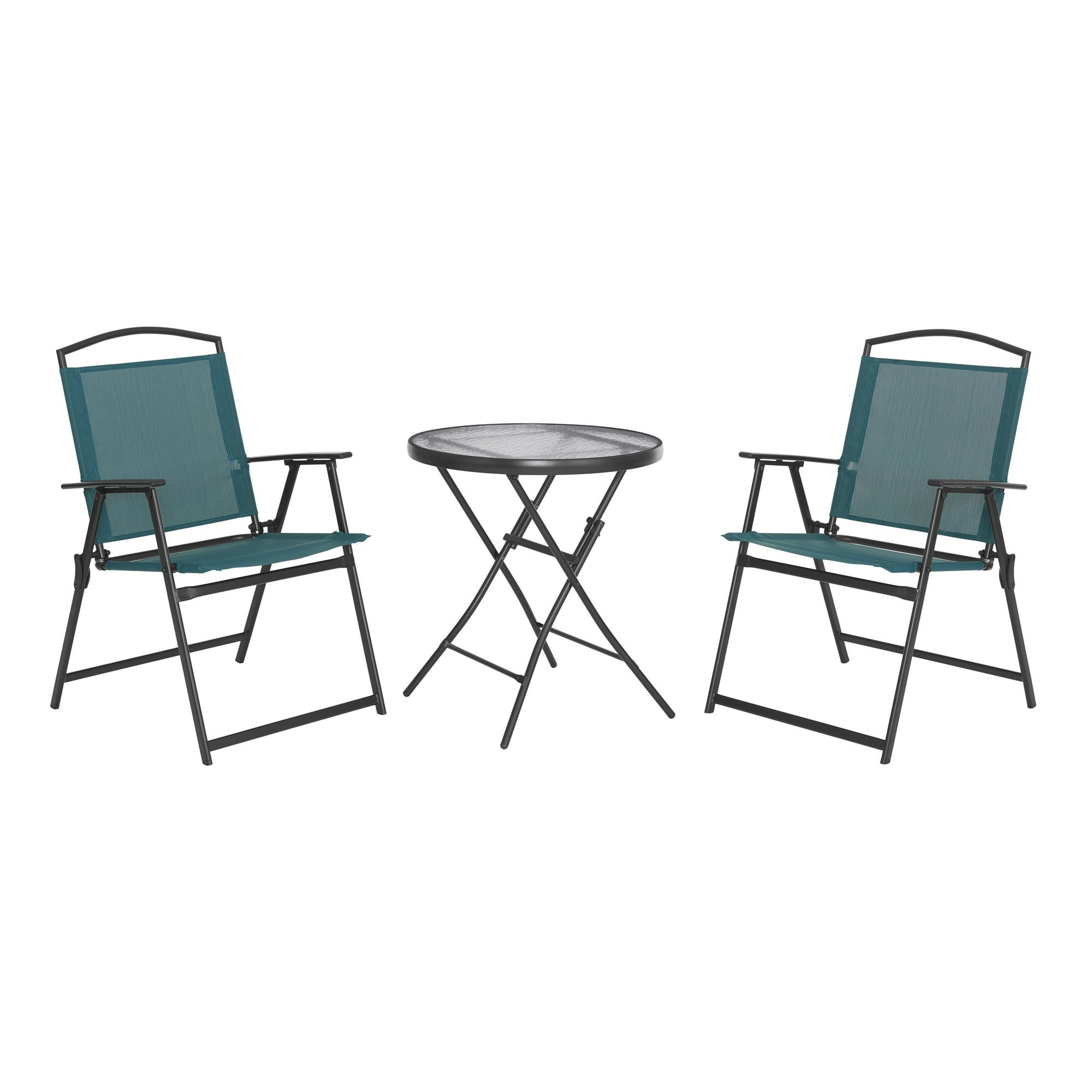 Add style and functionality to your outdoor spaces with the 3 Piece Bistro Set. This set includes a sleek bistro table and two chairs, all crafted with fade-resistant sling fabric that maintains its color and looks fresh even after extended use. The sturdy, rust-resistant steel frame is powder-coated to withstand the elements, ensuring long-lasting durability. The chairs and table fold flat for easy storage, making it convenient to stow away when not in use. The shatter-resistant tempered glass tabletop adds a touch of elegance and durability. Ideal for small patios, balconies, garden corners, or cozy outdoor nooks, the 3 Piece Bistro Set is a must-have for your outdoor space.