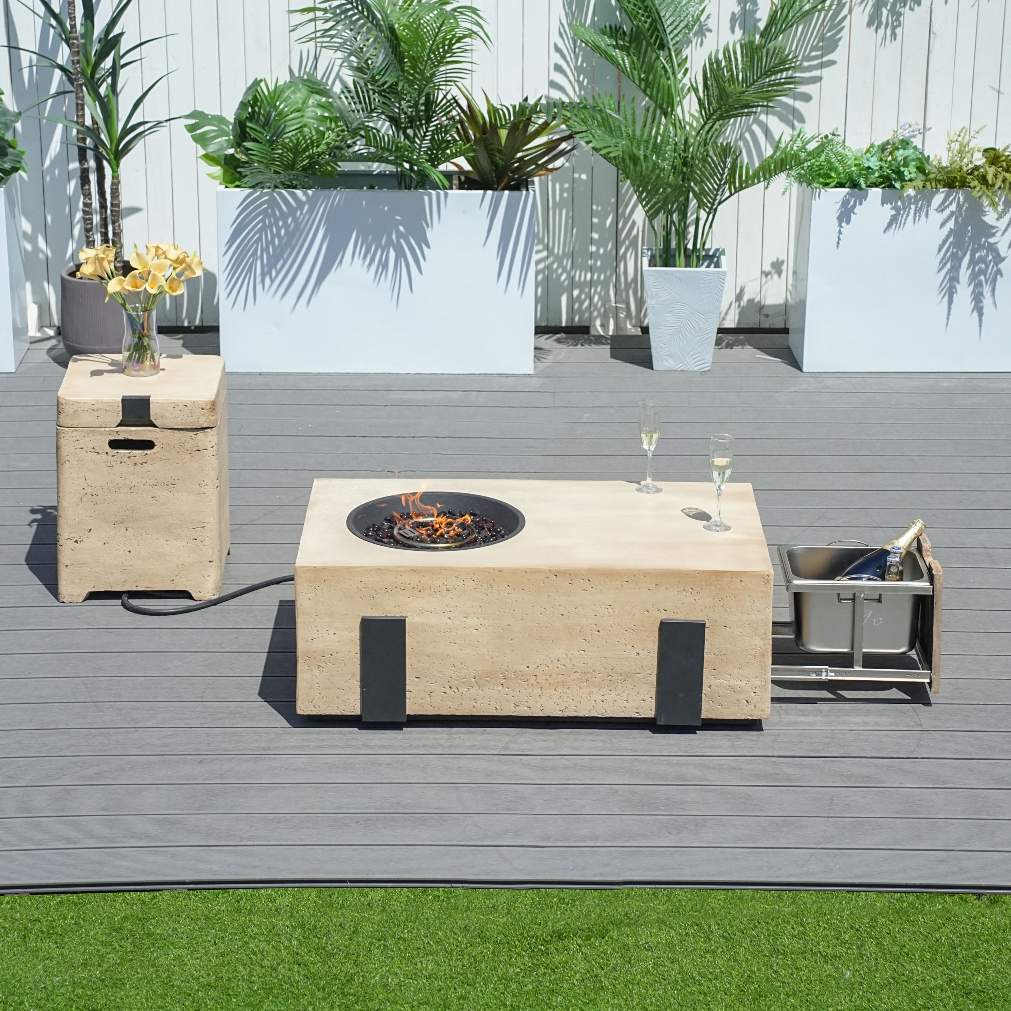 Upgrade your outdoor space with this stylish and versatile fire pit table set, designed for both warmth and convenience. With a sleek stone-like finish, this piece seamlessly blends aesthetics with functionality. Whether you're enjoying a cozy fire or chilling beverages in the hidden ice bucket, this set is perfect for any patio or backyard setting.