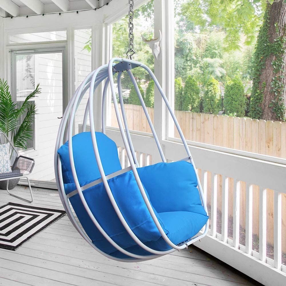 The hanging swing chair made with aluminum in white and plush all-weather fabric cushion; making it easy to immerse yourself in a good relax. Comes with a sturdy powder-coated aluminum frame and hanging chain apparatus that works well to enliven your patio; backyard; porch; or poolside decor. The hanging egg hammock chair are also popularly used in indoor lounge; living; or bedroom spaces. Also a awesome gift for family and friends.