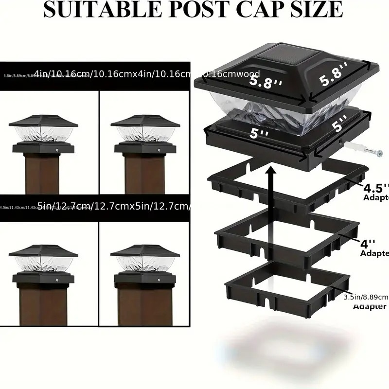 These solar cap lights are compatible with multiple wooden post sizes (3.5x3.5", 4x4", 4.5x4.5", and 5x5"), making them a flexible lighting solution for your fence posts, porch rails, or stairways. The lights are fully solar-powered, equipped with efficient panels that recharge during the day and automatically illuminate at dusk—no wires or electricity needed.