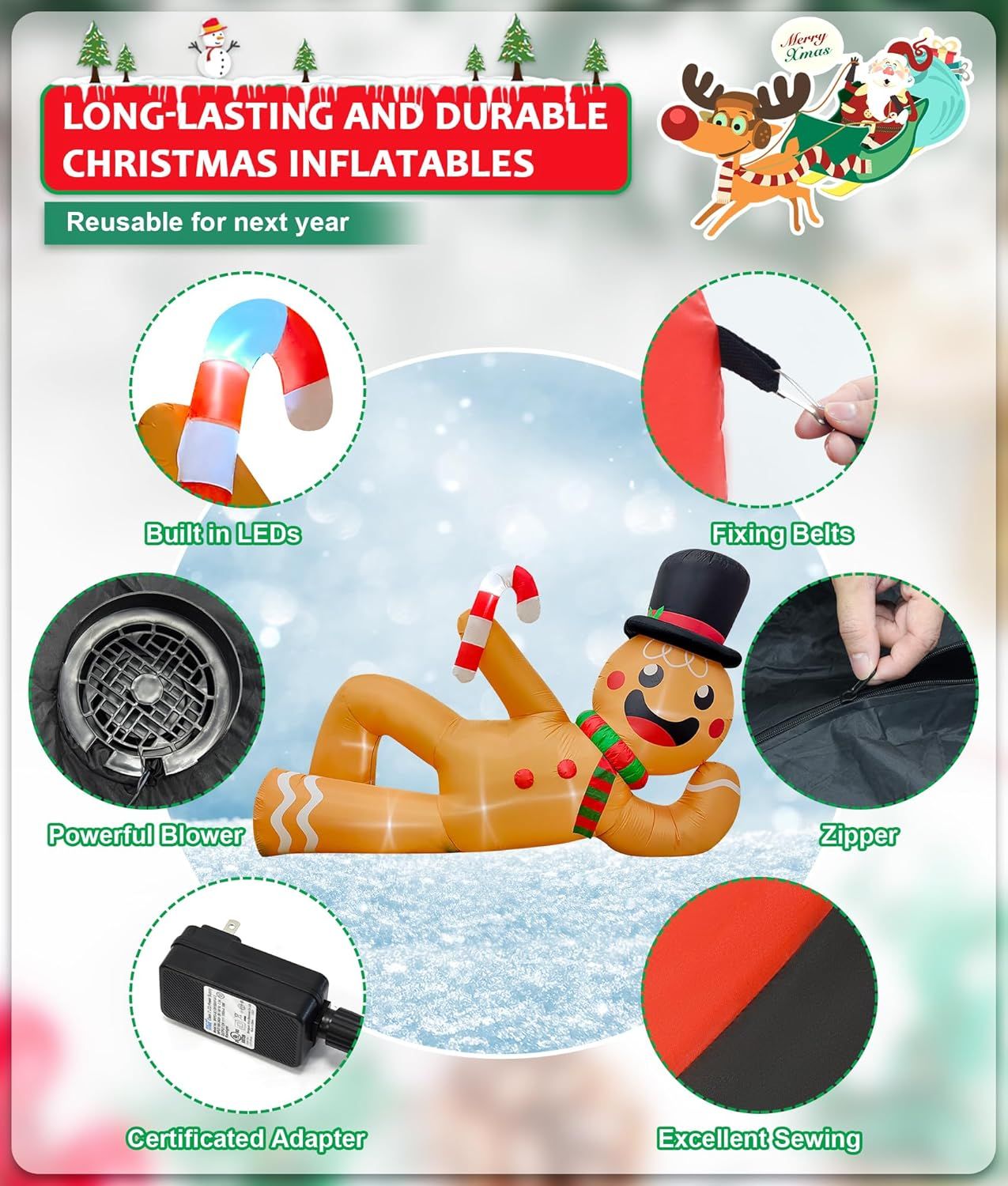 About this itemFunny & Creative: A large inflatable Gingerbread Man lying flat on the ground, greeting a Merry Christmas to everyone who passes by. It serves a special and pleasing Christmas ornament for outdoor decoration, such as mall, yard, patio, garden and lawn, helping you to welcome guest and create a strong Christmas atmosphereAffordable & Reusable: Made of premium waterproof polyester fabric with upgraded and excellent sewing craftsmanship, our Christmas inflatables features long-lasting, fade resistant, weather resistant and no air leakage, making it work well even in rain and snow. Gingerbread Man is a classic Christmas element that never out of style, so it is available for reuse to decorate Christmas in next yearMore Sturdy from Wind: To improve the stability of the Christmas inflatables when working outdoors, there are 2pcs 400g sandbags built inside to increase its bottom weight. Combined with belt loops, rope, and ground nails, the overall design of the inflatable Gingerbread man makes it more sturdy, ensuring normal use, even in windy,snowy, and rainy weatherBuilt-in LED Light: To enhancing the viewing experience and decorative effect, the Christmas blow ups is designed with 6 LED lights inside to light up its body, making it better viewing at night and creating strong festival atmosphere for Christmas. It's a great Xmas ornament for both indoor and outdoor party decorations in this New YearEasy Setup & Fast Inflation: EAONE Christmas inflatables is equipped with a strong blower, easy to operate. Unfold and zip up the Christmas inflatable in an open area, plug in the adapter, you will got a unique and attractive Christmas decoration in a few minutes