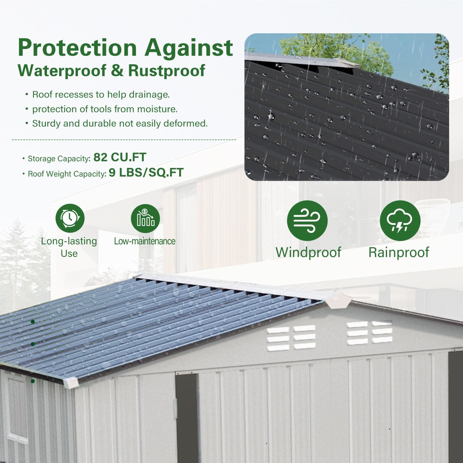 [Metal Material, Quality Selection]: Made of prepainted galvanized steel plate, it undergoes multiple anti-rust treatments. Equipped with a sealed waterproof roof and wind-resistant structure, compared with wooden or plastic storage sheds, metal material boasts have higher strength and durability. It is less prone to deformation, cracking, and fading, and requires less frequent maintenance. This will saves time and costs, it is a reliable choice for long-term outdoor storage.