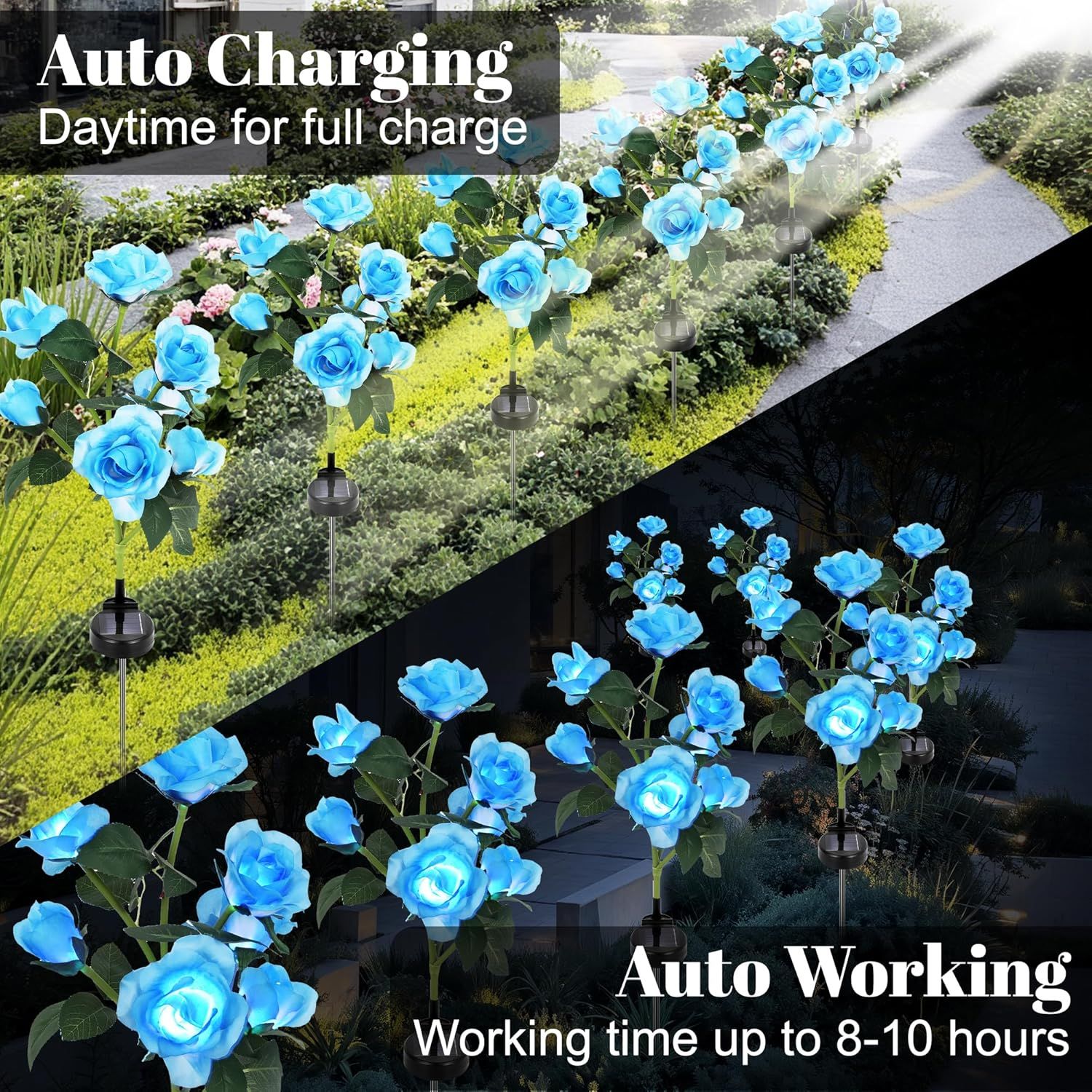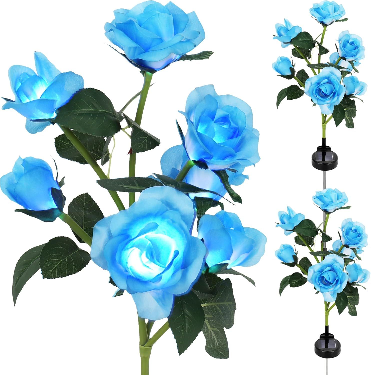 Enchanting Solar Rose Stake Lights: 2 pack realistic solar flower lights with 14 artificial roses, Transform your outdoor space with our realistic solar rose lights, featuring lifelike petals that glow in dazzling colors. Perfect for adding a touch of elegance to gardens, pathways, or patios—day or night!Effortless Solar-Powered Operation: No wiring, no electricity costs! Equipped with a high-efficiency 600mAh solar panel, these lights charge by sunlight and auto-illuminate at dusk, providing eco-friendly, hassle-free lighting all year round.Mesmerizing 7-Color Changing Display: Create a magical atmosphere as the roses cycle through 7 vibrant hues—ideal for holidays, parties, or everyday charm. Watch your garden come alive with a captivating light show!All-Weather Durability (IP65 Waterproof): Built to last with IP65 waterproof & weatherproof materials, these stakes endure rain, snow, and extreme temperatures. Enjoy vibrant, reliable lighting in every season!Unforgettable Gift for Garden Lovers: A unique & heartfelt present for Mother’s Day, birthdays, or anniversaries. These solar roses combine beauty + sustainability, making them a gift that keeps on glowing!