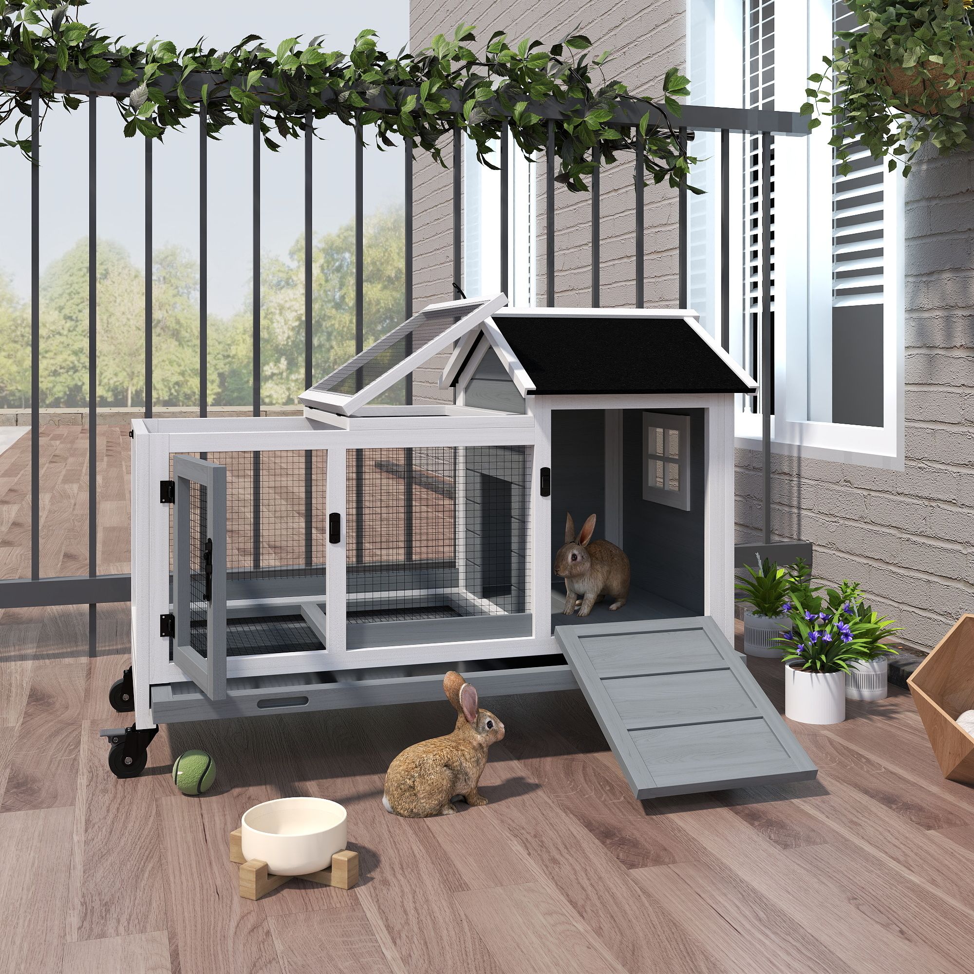• - Mobile Rabbit Hutch: Four wheels at the bottom move this guinea pig cage inside and outside easily. It includes a house for shelter and a run where pets can roam in the fresh air.